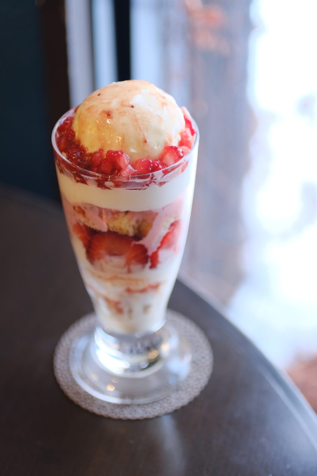 苺、バニラアイス、苺アイス、ホイップクリーム、苺ソース、苺のシフォンケーキ、玄米フレークの苺づくしのパフェ。