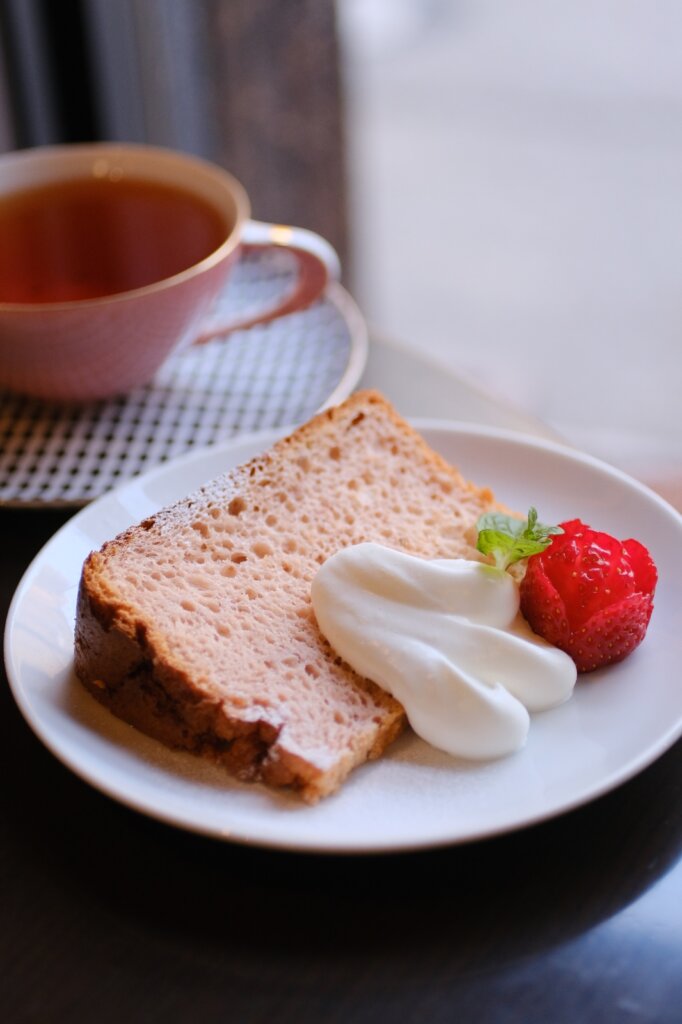 生の苺をペースト状にして生地にたっぷり混ぜ込み、しっとり焼いた苺のシフォンケーキです。