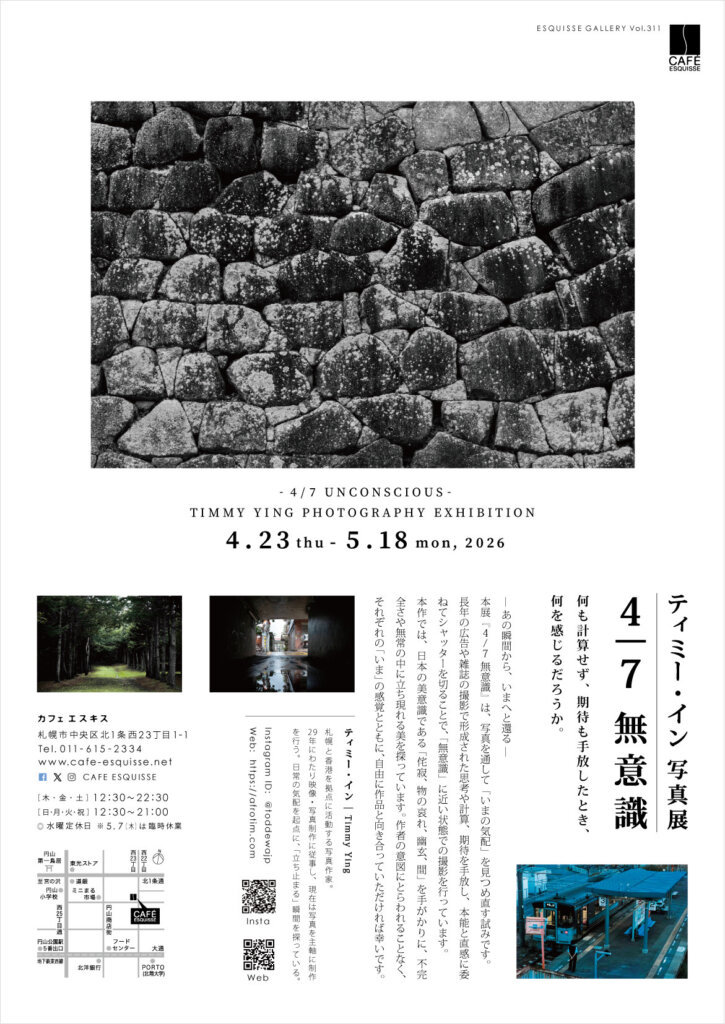 次回は香港出身、札幌市在住の写真家、ティミーさんの作品展です。