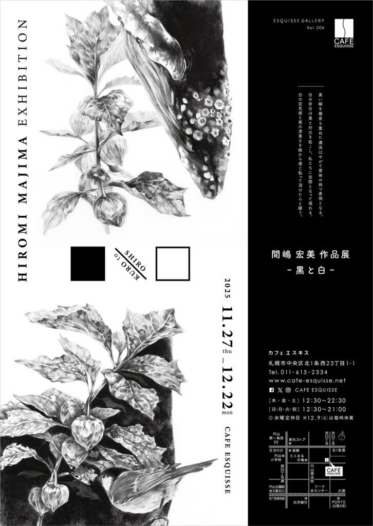 次回は札幌市在住の作家、間嶋宏美さんの作品展です。 前回は、2021年に札幌に移住された翌年、当店でリトグラフによる版画の作品展を開催されましたが、今回はダーマトグラフと鉛筆を用いて、鯨や野鳥、植物などを描いた作品を出展 …