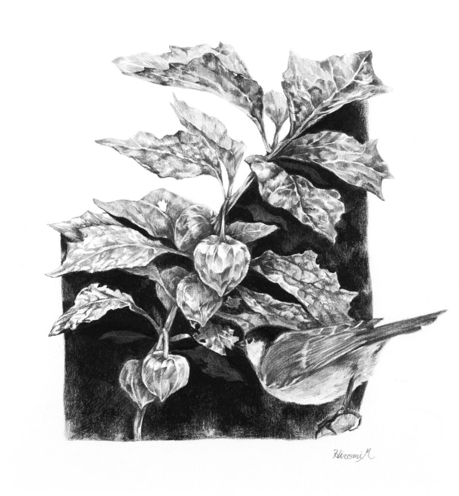 モノクロ画を描くきっかけとなったのは大学生の時です。当時は鯨を主役に版画のリトグラフで制作していました。現在は鯨だけでなく、植物や動物を紙に描画材で描いています。画材は三菱が販売してる油性ダーマトグラフと鉛筆を使い、ケント紙などに描いています。