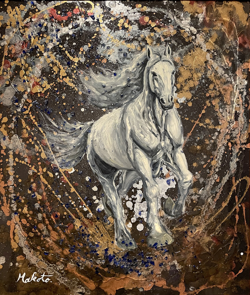 2024年からアルコールインクやレジンなどを積極的に取り入れ、ミクストメディアへと表現の幅を広げている。モチーフは動物、風景、幻想的な存在まで多岐にわたり、そこには「宇宙的な広がり」「自然界に宿る循環のエネルギー」が一貫して息づいている。